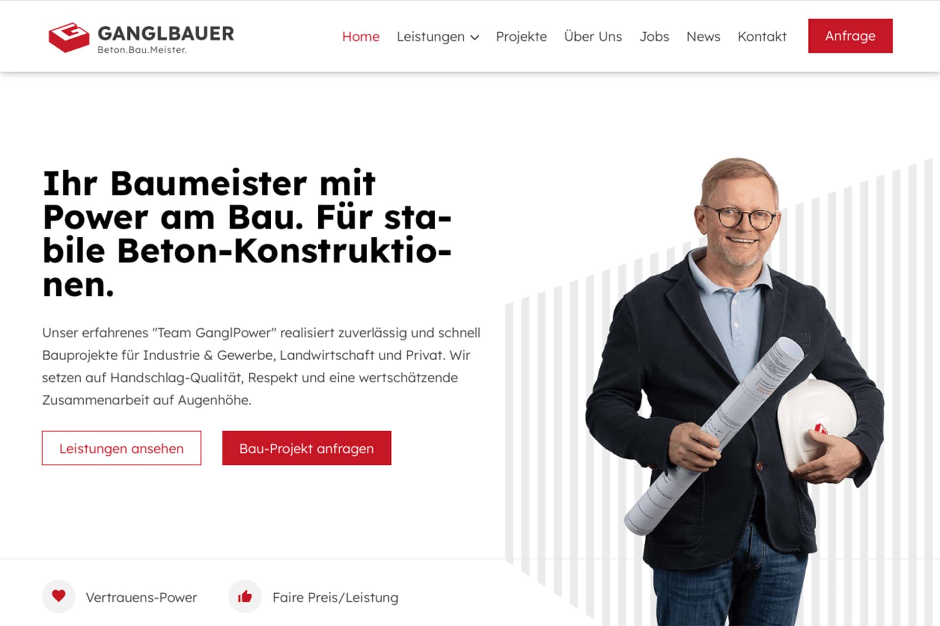 Für Ganglbauer Bau, den regionalen Experten für robuste Betonkonstruktionen, haben wir eine moderne WordPress-Website erstellt, die die Kompetenz und die Leidenschaft von Ganglbauer widerspiegelt. Mit dem Motto “Beton.Bau.Meister mit Power am Bau” vermittelt die Website die Stärke und Zuverlässigkeit, die Ganglbauer in jedes Projekt tatkräftig einbringt, egal ob für Industrie und Gewerbe, die Landwirtschaft oder private Bauvorhaben.